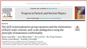上世纪八十年代,Brodsky、Lepage和Mackenzie等人提出BLM方案,影响深远,迄今已被引用上千次,但其缺陷也十分明显,不可能被作为一个终极的解决方案。作为国际知名的QCD专家,Brodsky和Lepage教授先后获得了美国物理学会樱井奖。但在随后长达30年的探索中,虽然有一些思想上的萌芽,Brodsky教授及其合作者在此课题上一直未有明显进展。直至2011年,吴兴刚教授在斯坦福大学访问时,与Brodsky教授合作,提出最大共形原理(PMC)以及PMC-BLM对应原理,给出第一种可完成直至任意微扰阶的能标设定方案。该方案于2012年发表在Phys.Rev.D和Phys.Rev.Lett.(解决了当时顶夸克对前后不对称性问题,国际上在三年后完成的严格两圈计算证明了当时结论的正确性)。2013年,他们和当时正在斯坦福大学访问的博士生Mojaza提出实现PMC的第二种方案,从数学上进一步完善了PMC,该项工作发表在Phys.Rev.Lett.(详细论证发表于2014年Phys.Rev.D),审稿人甚至认为这项工作可媲美重整化理论。