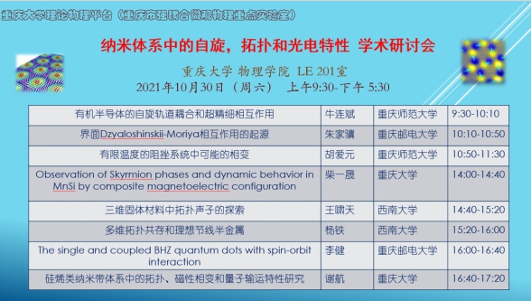 与会的老师们围绕有机半导体的光电特性、界面的DM相互作用、阻挫体系的磁性相变、斯格明子特性以及拓扑声子材料等相关领域前沿的研究课题进行了深入和热烈的讨论。此次研讨会也吸引了多位感兴趣的老师和研究生参与,通过此次研讨会,与会人员深入了解了重庆市高校相关领域学者的研究进展,加强了学术交流,为今后的合作奠定了良好的基础。