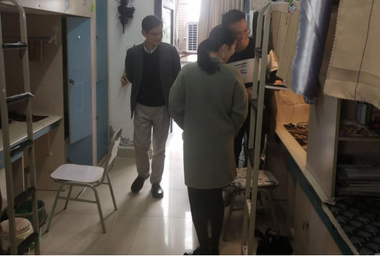 检查小组首先对大二的寝室进行了检查,大二学生学习生活用品较多,许多学生自主贴上了墙纸,购买了许多收纳的小物件,各类物品较多,大多数寝室卫生比较整洁,未发现大功率电器。在检查过程中,余涛老师对同学们寝室漏水、墙壁泛黄、热水器使用等生活情况进行了详细了解,并担心这些问题会给学生在冬天正常生活造成困扰,建议寝室成员打电话给维修人员,尽早解决问题。