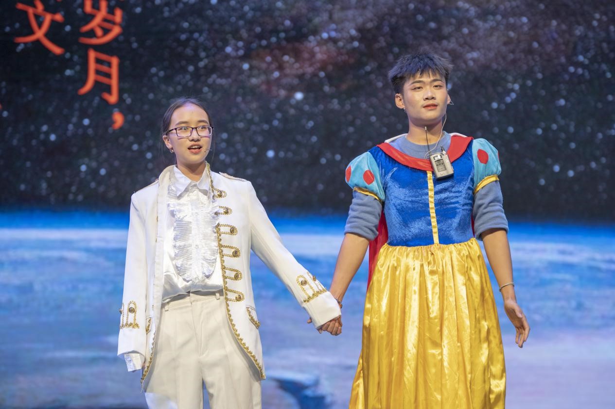 由2020级同学代表呈现的小品《白雪公主新编》将家喻户晓的童话改编反串,在加入了许多新梗的同时,赋予了整个故事不同的结局,白雪公主的宽容原谅会让皇后最后的改变升华了对善与恶的思考。
