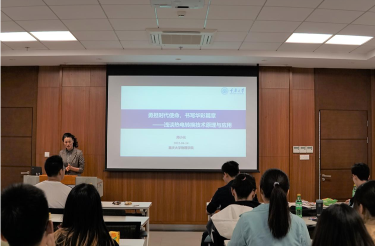周老师首先讲述了自己在国外的求学经历,接着介绍了自己的研究领域——热电转换技术的原理与应用。给大家展示了热电现象背后的物理原理,帮助大家回忆已学的专业知识,并鼓励同学们在今后的学习过程中认真学习量子力学和固体物理。接着展示了热电技术的优势和前沿应用,热电技术在现代生活中应用非常广泛,发展潜力很大。