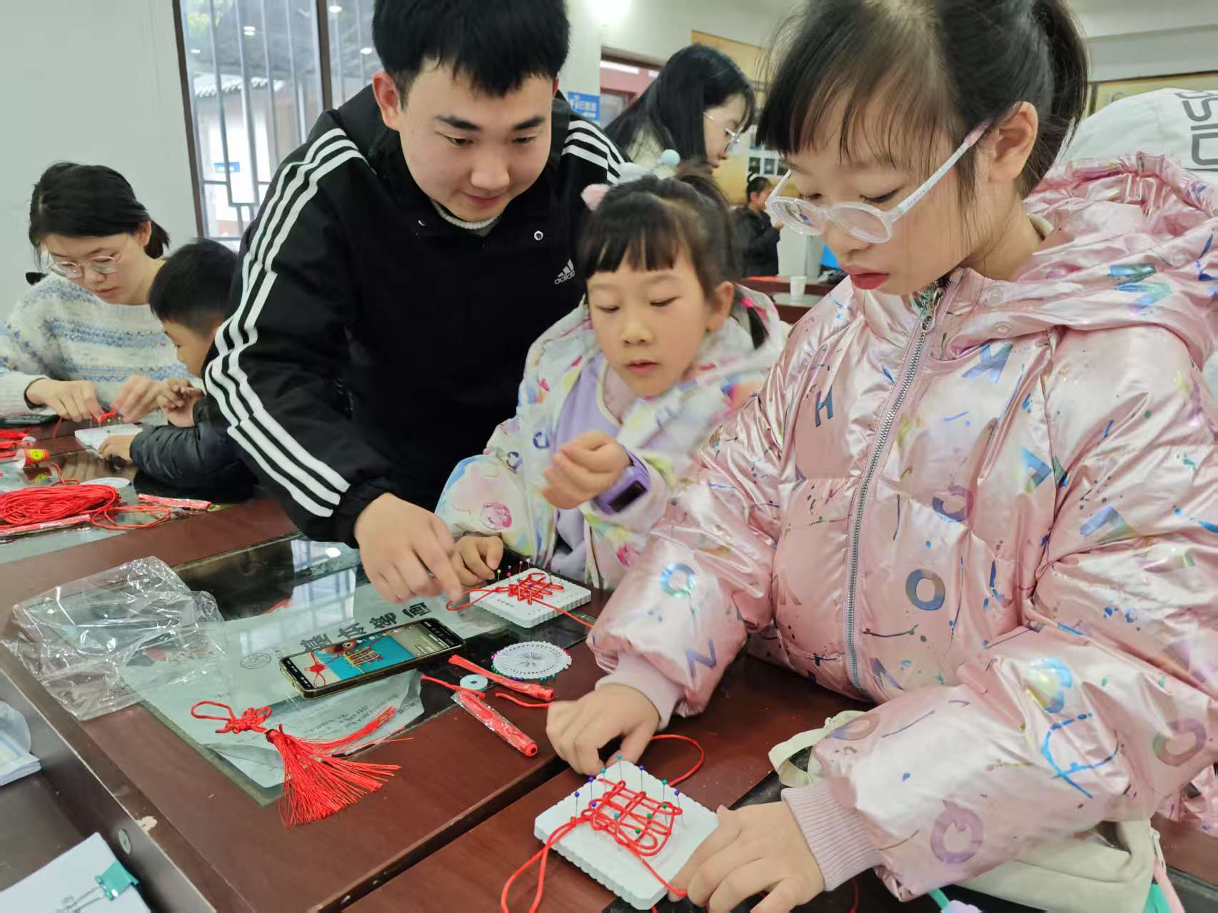 实践团带来了中国结编织、扭扭棒创意、花灯制作、糖画绘制和年画拓印等手工制作项目,是本次活动的亮点之一。志愿者们带领大家一起动手制作中国结、扭扭棒、花灯、糖画以及年画拓印等传统手工艺品。