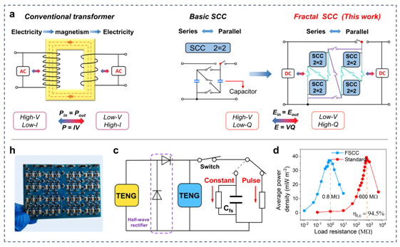 图1,分形结构开关电容换能器及其TENG电源管理系统。a,传统变压器、基本2单元的SCC单元和8单元的FSCC的对比;b, 96单元的FSCC实物图;c, 基于FSCC的TENG电源管理电路图;d, 恒流模式下FSCC电源管理电路和标准电路的平均输出功率。