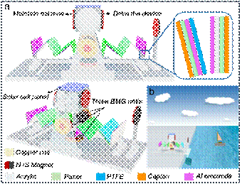 奚伊教授,刘如川教授和美国佐治亚理工学院王中林院士为共同通讯作者。该论文设计了一种非封装的单摆式纸基杂化发电机,该发电机主要包括三个部分:一个太阳能电池板,两个纸基Z字型层状摩擦发电机,三个电磁发电单元(如图1所示),可同时收集太阳能,人体运动的机械能,也是一种全新的蓝色能源采集方式。工作原理为将海水表面振动的机械能转换为磁铁上下运动的能量,并利用磁铁间的排斥力驱动整个器件工作。由于避免了器件与海水的直接接触,因此解决了稳定性差,封装和拆卸重组困难的问题。该工作提出了一种用于多种能量采集的新颖杂化发电机,在便携式能源,导航和照明方面具有潜在的应用价值。