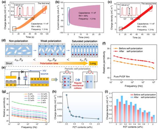该工作首次研究并提出了极性高介电材料自极化效应。通过利用电荷激励产生的定向高电场成功地使极性复合膜中的偶极矩沿电场方向偏转。同时,在钢片电极与复合膜的周期性接触分离过程中,具有压电性能的复合膜会持续受到碰撞应力,这进一步提高了偶极矩的偏转速度。因此,极性复合膜在电荷激励摩擦纳米发电机的工作过程中实现了自极化,并有效地提高了复合膜的实际相对介电常数,从而显著地增加了TENG的电荷密度。最终,成功地获得了稳定的超高输出电荷密度3.53 mC m-2。这项工作为薄膜极化提供了一个简单有效的方法,也对进一步提高TENGs的输出具有重要的启发意义。