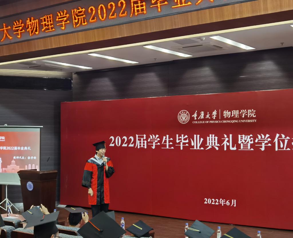 教师代表张学峰为毕业生分享教学工作中的感悟与对毕业生同学们的美好祝愿。张老师以轻松诙谐的方式讲述了教学工作中与同学们的互动趣事,真诚感人,并祝愿同学们乘风破浪、前程似锦。