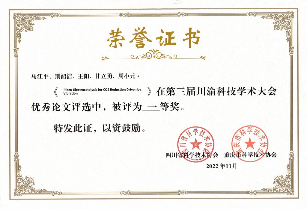 周小元教授团队发表的论文《Piezo-electrocatalysis for CO2 Reduction Driven by Vibration》荣获第三届川渝科技学术大会优秀论文一等奖。