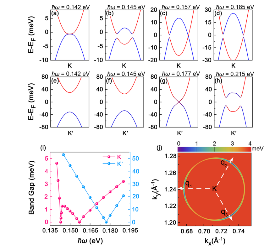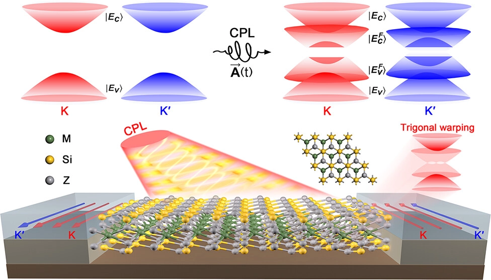 图2:二维半导体MSi2Z4族材料中光诱导的三角翘曲(trigonal warping)效应和不同能谷发生多次能带反演(multiple band inversion)。