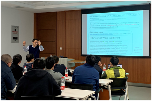 罗洪刚教授在虎溪校区理科楼LA106为学院师生作了题为《量子多体系统的困境与解决途径初探》的学术报告。在报告中,罗洪刚教授首先分析粒子图像导致的多体问题的困境并简要提及相变研究的线索,然后提出粒子的有组织模式(图案,pattern)可能提供一个解决途径。然后,以一维横场伊辛模型为例,演示如何生成图案并应用于理解该模型的相变。罗洪刚教授在报告中指出,复杂的衍生现象背后的基本规则都是非常简单的,寻找并揭示这些简单的规则如何衍生出复杂的物理现象是理论物理发展的基本目标之一。最后,罗洪刚教授与参会师生进行了热烈地交流讨论,并详细解答了现场老师和同学提出的问题。