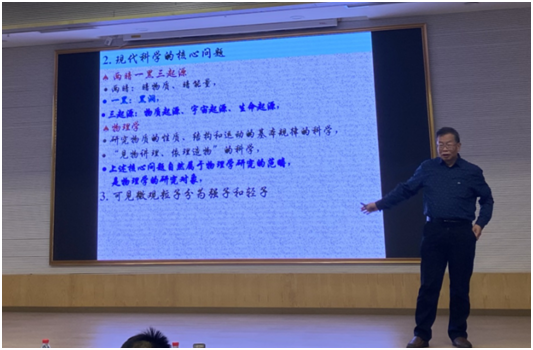 在报告中,刘玉鑫教授首先介绍了一些教育理念和教育方法研究,书院制教育模式的兴起与发展。然后,讲解了物质的基本组分与演化,以及对称性与群论在其中的应用。还介绍了“可见物质演化过程可表述为强相互作用物质的相变”的思想,引出QCD相变的相关研究。最后,刘玉鑫教授与参会师生进行了热烈地交流讨论,并详细解答了现场同学提出的问题。
