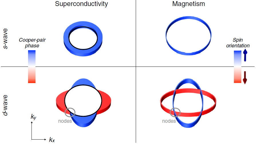 长期以来,物理学对磁性物质的认知主要建立在铁磁(所有磁矩同向排列,产生宏观磁性)和反铁磁(相邻磁矩反向排列,宏观磁性抵消)两大框架之上。近年来发现的交错磁性(Altermagnetism)作为第三种基本磁序,彻底改变了这一传统版图。该类材料兼具两者的优点:既像反铁磁体一样净磁矩为零,对外界杂散磁场不敏感,又像铁磁体可在动量空间中产生独特的非相对论性电子自旋劈裂。这种动量空间中交替变化的自旋极化(如d波、g波对称性),使其成为非常规超导体的“磁性镜像”,揭示了凝聚态物理中深刻的对称性关联(图1)。