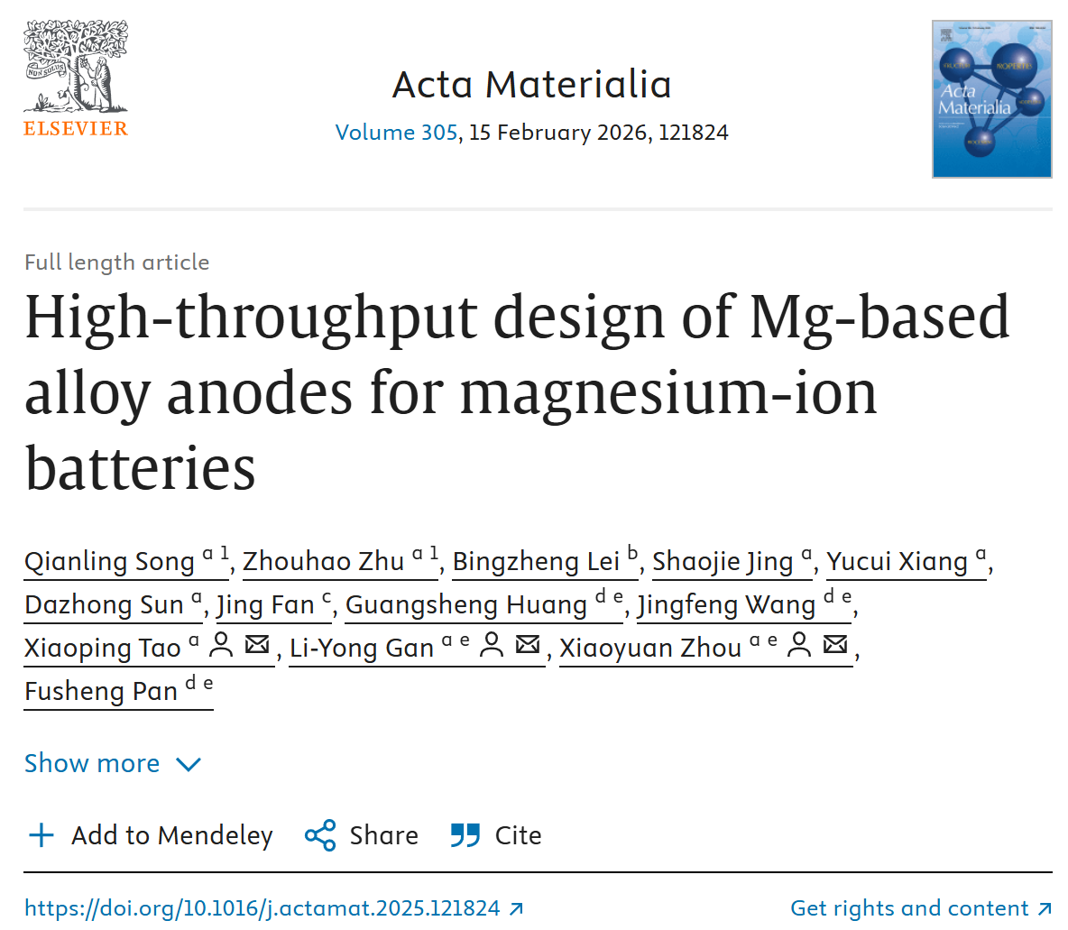 周小元教授、甘立勇教授和陶晓萍副教授团队联合材料科学与工程学院潘复生院士团队、重庆新型储能材料与装备研究院等在国际知名期刊Acta Materialia上发表了题为 “High-throughput design of Mg-based alloy anodes for magnesium-ion batteries” 的研究论文。该工作创新性地融合了机器学习预筛选、高通量第一性原理计算与多维性能评估,成功构建了一套高效的材料设计范式,有望推动镁电池乃至其他多价离子电池电极材料的理性设计与开发。