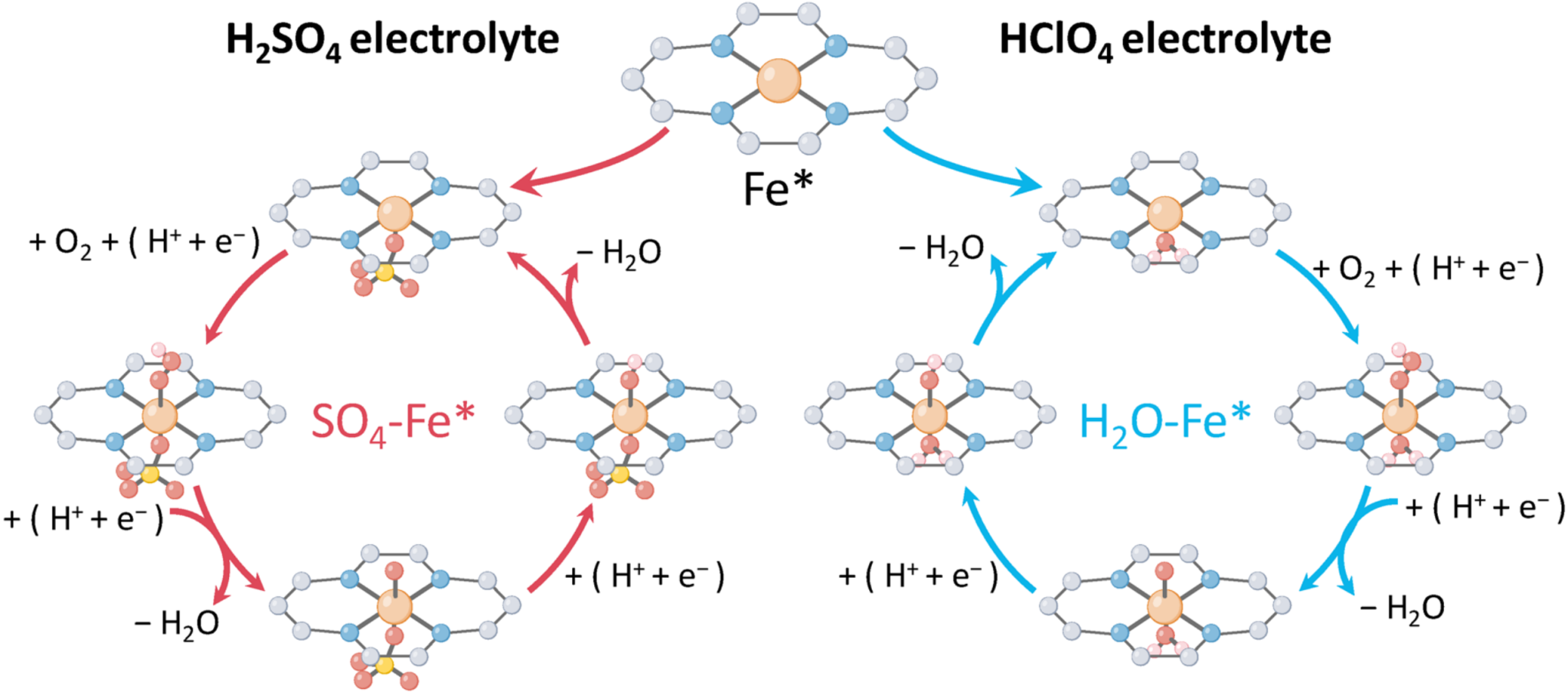 图1:Fe-N-C SACs在H2SO4和HClO4电解质中的ORR示意图。