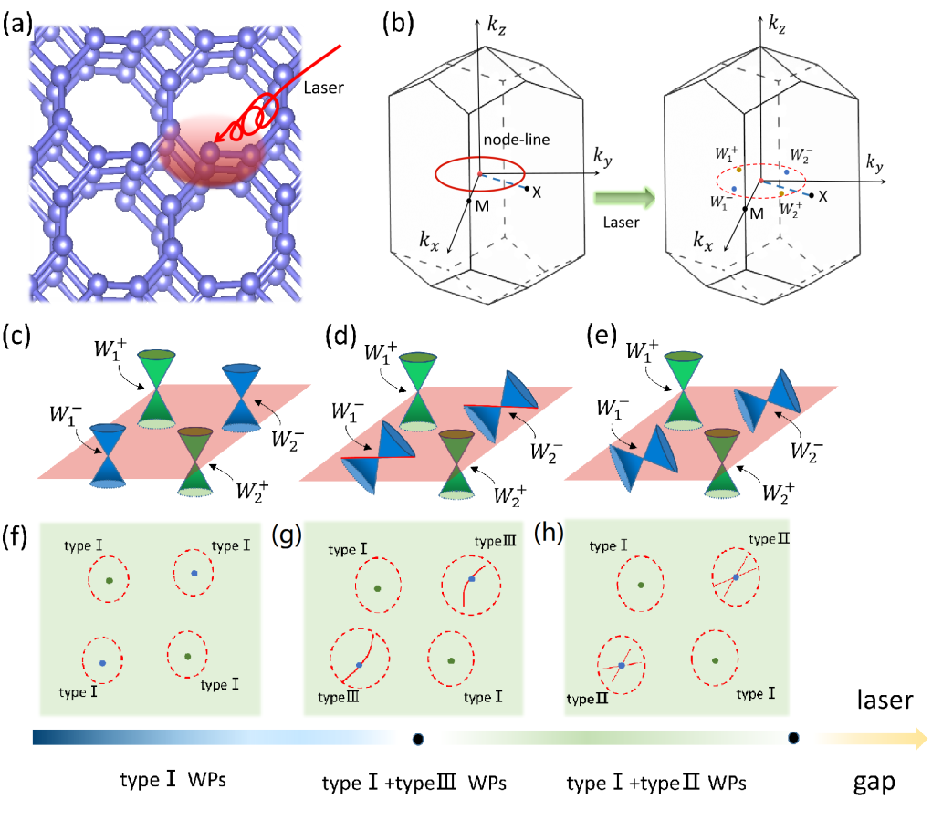 该工作中,作者首先结合第一性原理计算构造出可以描述真实材料能带结构的紧束缚模型,然后利用Floquet理论发展了研究光场驱动下固体电子能带结构的一般方法。通过计算各种光入射方向和偏振态的电子能带结构发现,具有拓扑节线半金属的碳同素异形体(body-centered tetragonal C16)可以演化为外尔半金属。更重要的是,通过调节入射光的强度,首次在现实材料系统中实现了由不同类型外尔点配对构成的非传统外尔对。这是该工作的一个重要突破。该工作也得到了审稿人高度评价,认为该工作非常及时,“This is very interesting in my opinion since realistic platforms to realize Floquet physics are scarce”,“The study is timely and meets the relevant criteria of potential impact and innovation”。
