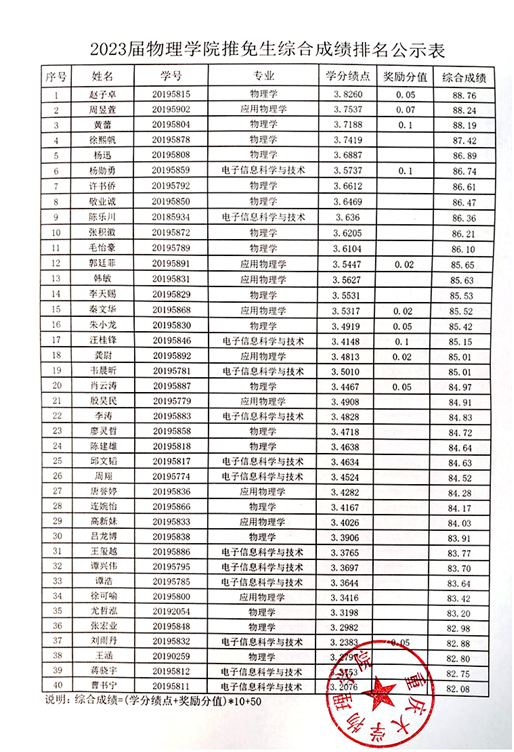 根据学校《关于开展2023年推荐优秀应届本科毕业生免试攻读研究生工作的通知》和《 伊莉讨论区 本科毕业生推免攻读硕士研究生实施细则》的相关规定,经过报名、初审、公开答辩程序,现将 伊莉讨论区 2023届推免生综合成绩排名予以公示: